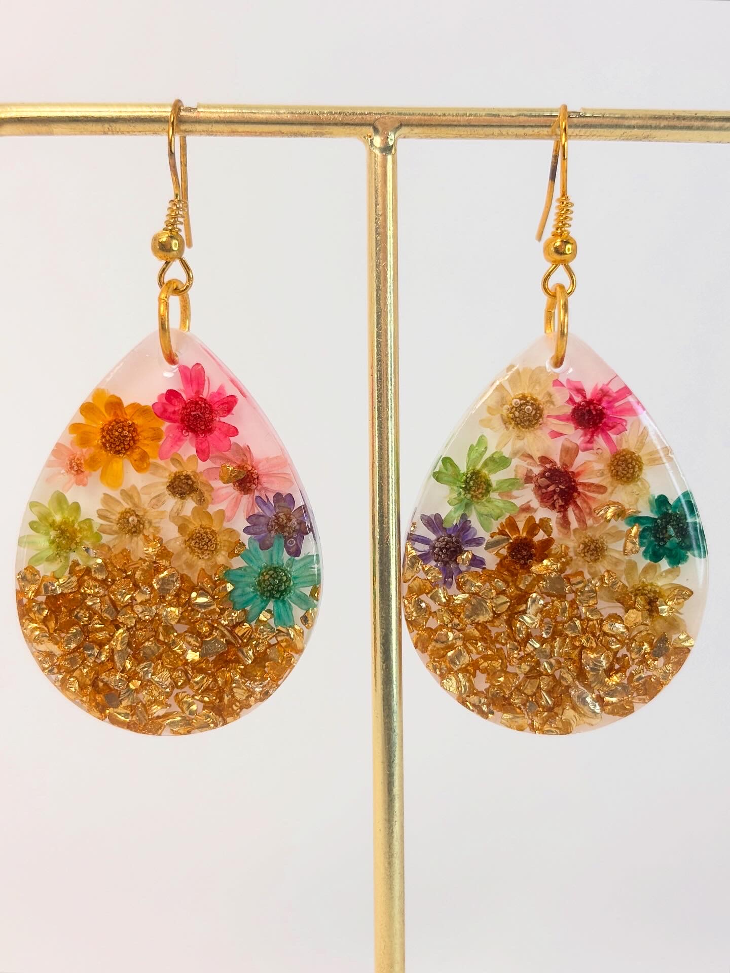 Capturez l’esprit joyeux d’un été éternel avec ces superbes boucles d’oreilles pendantes en résine de fleurs de glixia arc-en-ciel. Chaque breloque en forme de larme est méticuleusement fabriquée à la main par Clair de Maya, avec de vraies petites fleurs de Glixia dans un dégradé arc-en-ciel vibrant, magnifiquement contrastées avec des flocons d’or scintillants.