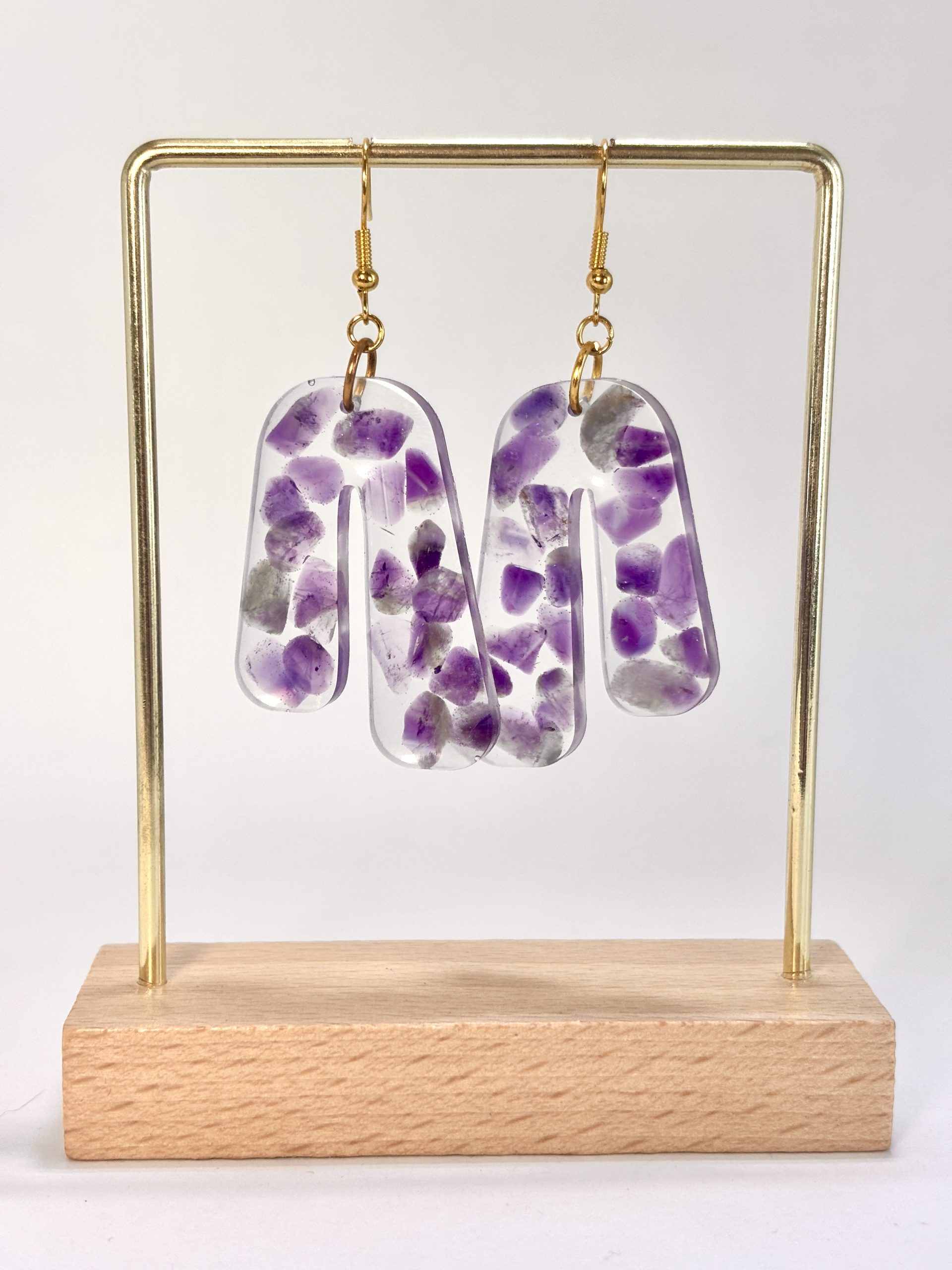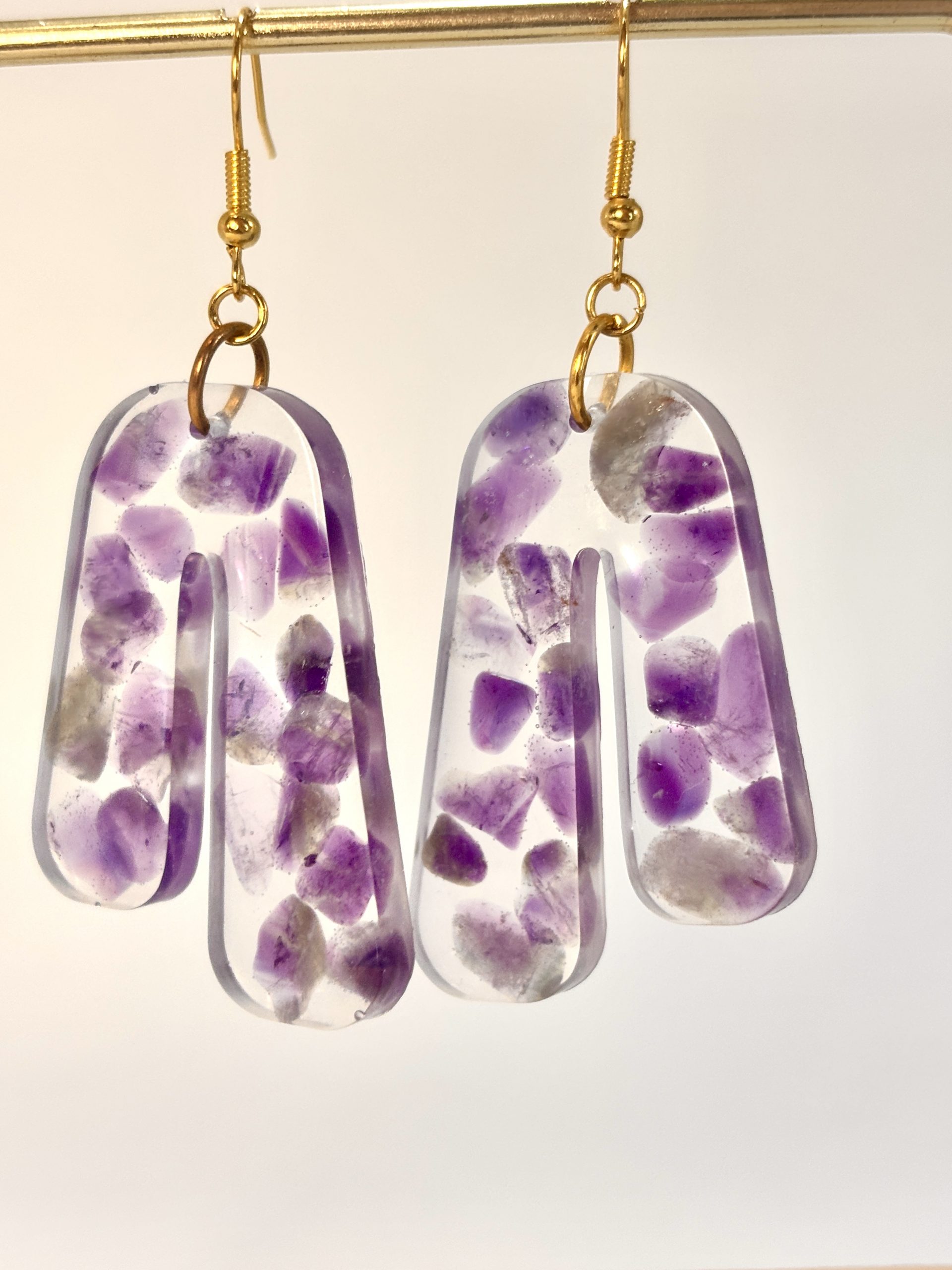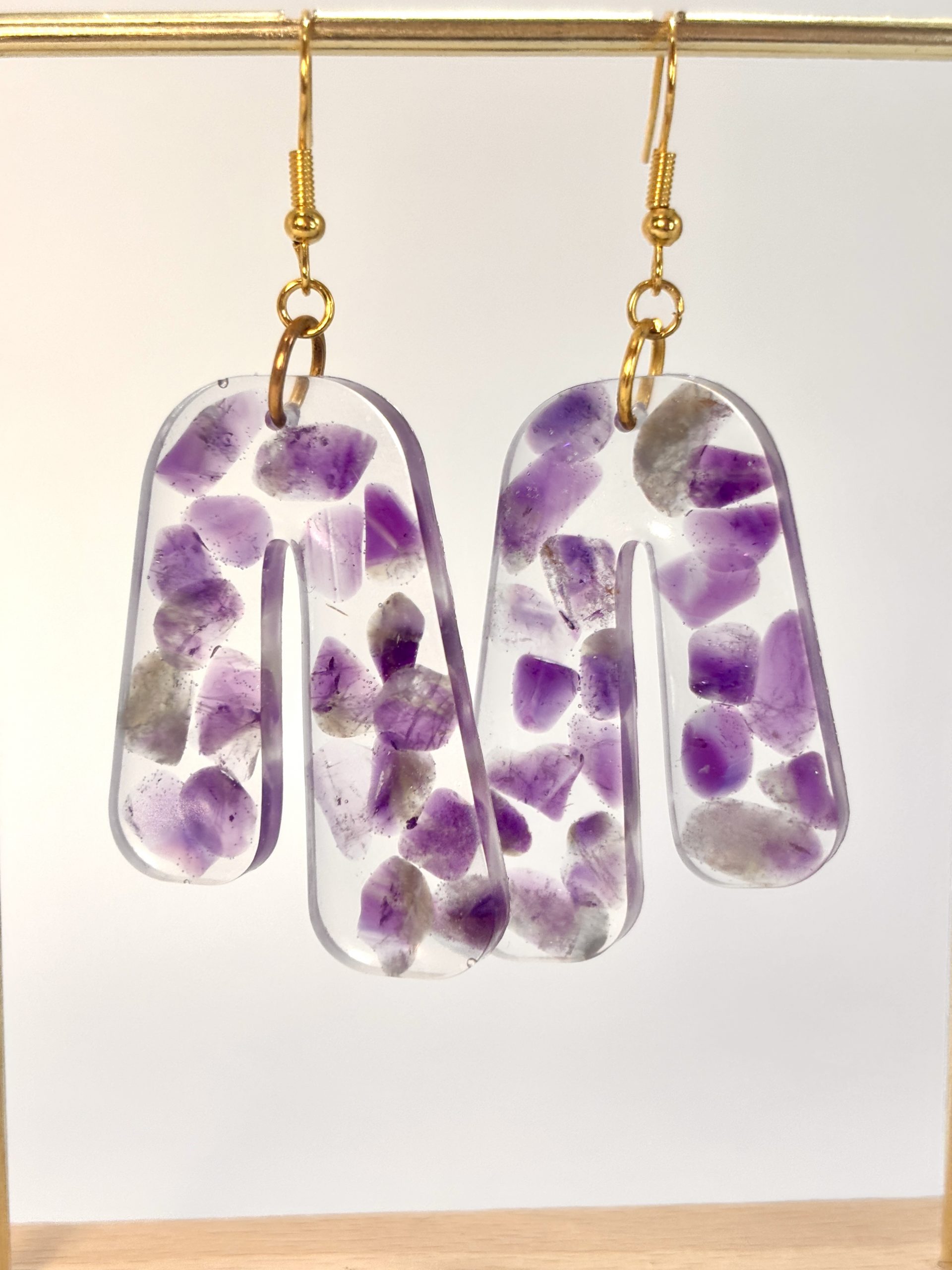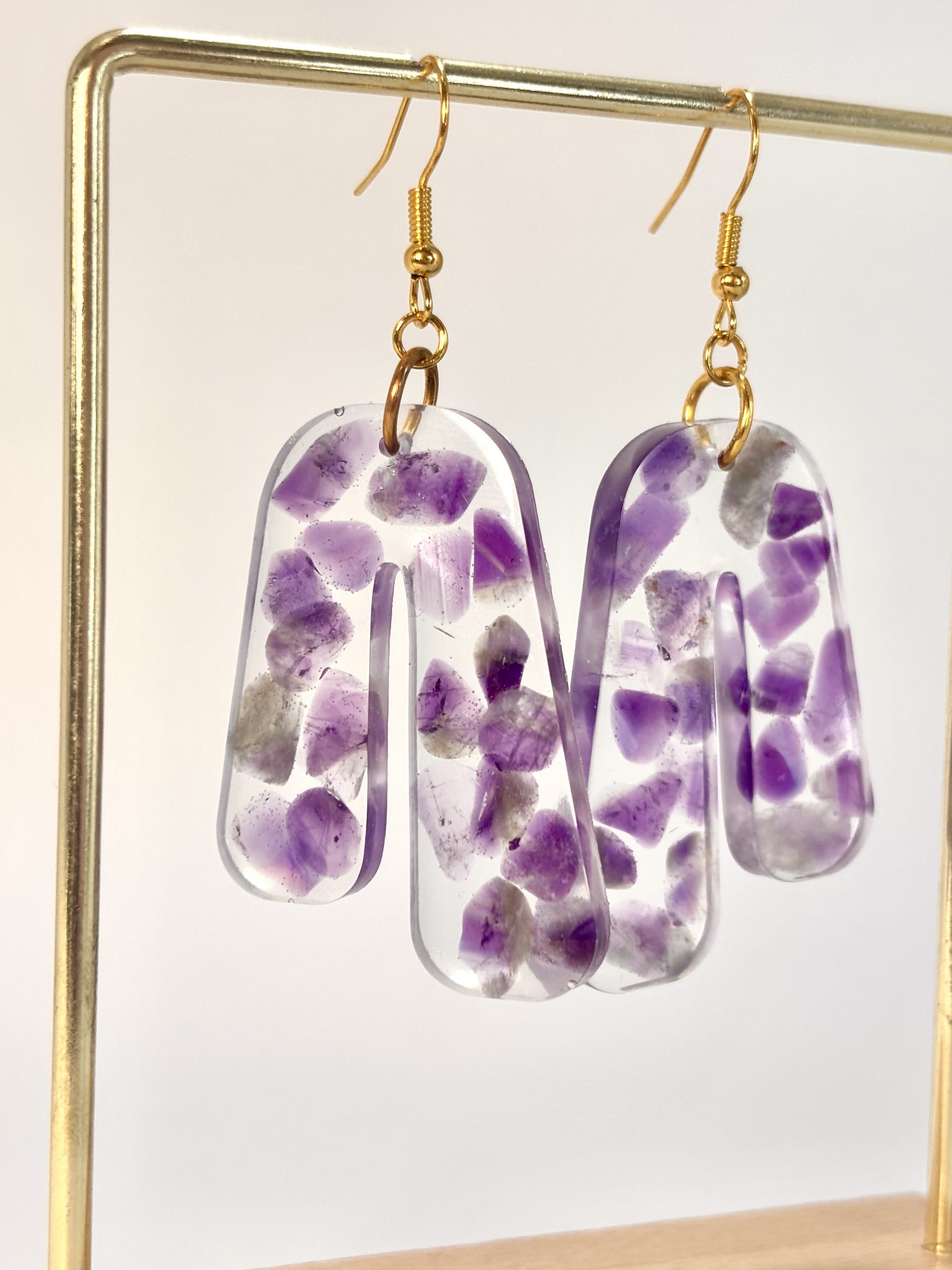 Nous vous présentons ces boucles d’oreilles uniques en forme d’arches asymétriques, au cœur desquelles nous avons délicatement déposé des éclats d’améthyste naturelle. La résine transparente joue ici le rôle de lentille : elle protège les pierres tout en leur permettant de rayonner dès qu’un rayon de soleil les effleure. Grâce à la technique de coulée à la main, la disposition des minéraux est unique pour chaque paire. C’est un bijou que vous ne retrouverez chez personne d’autre.