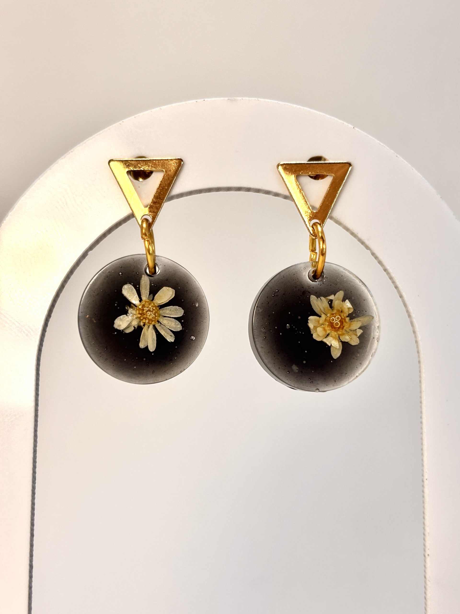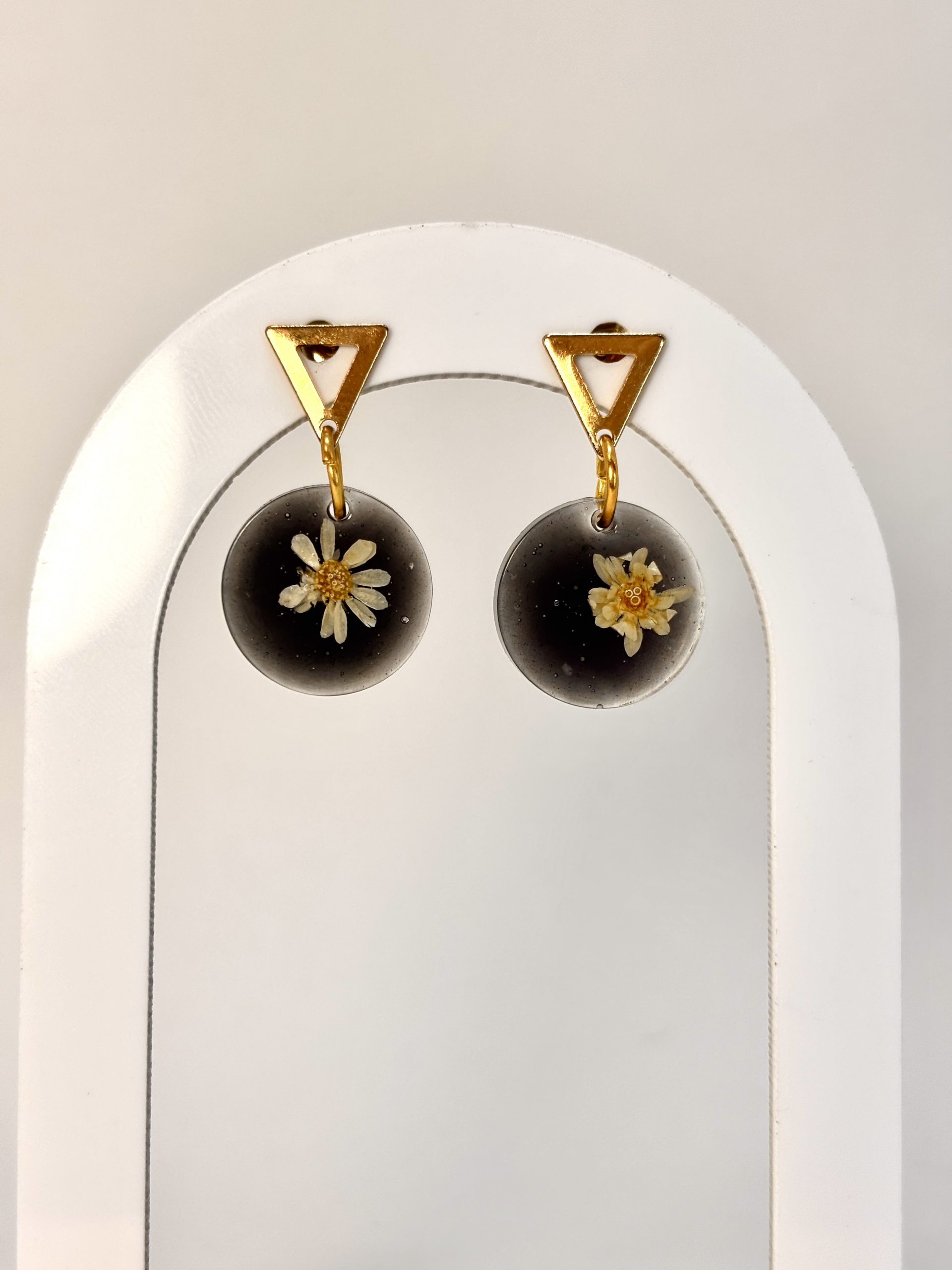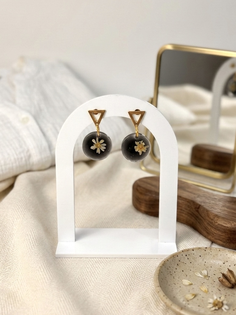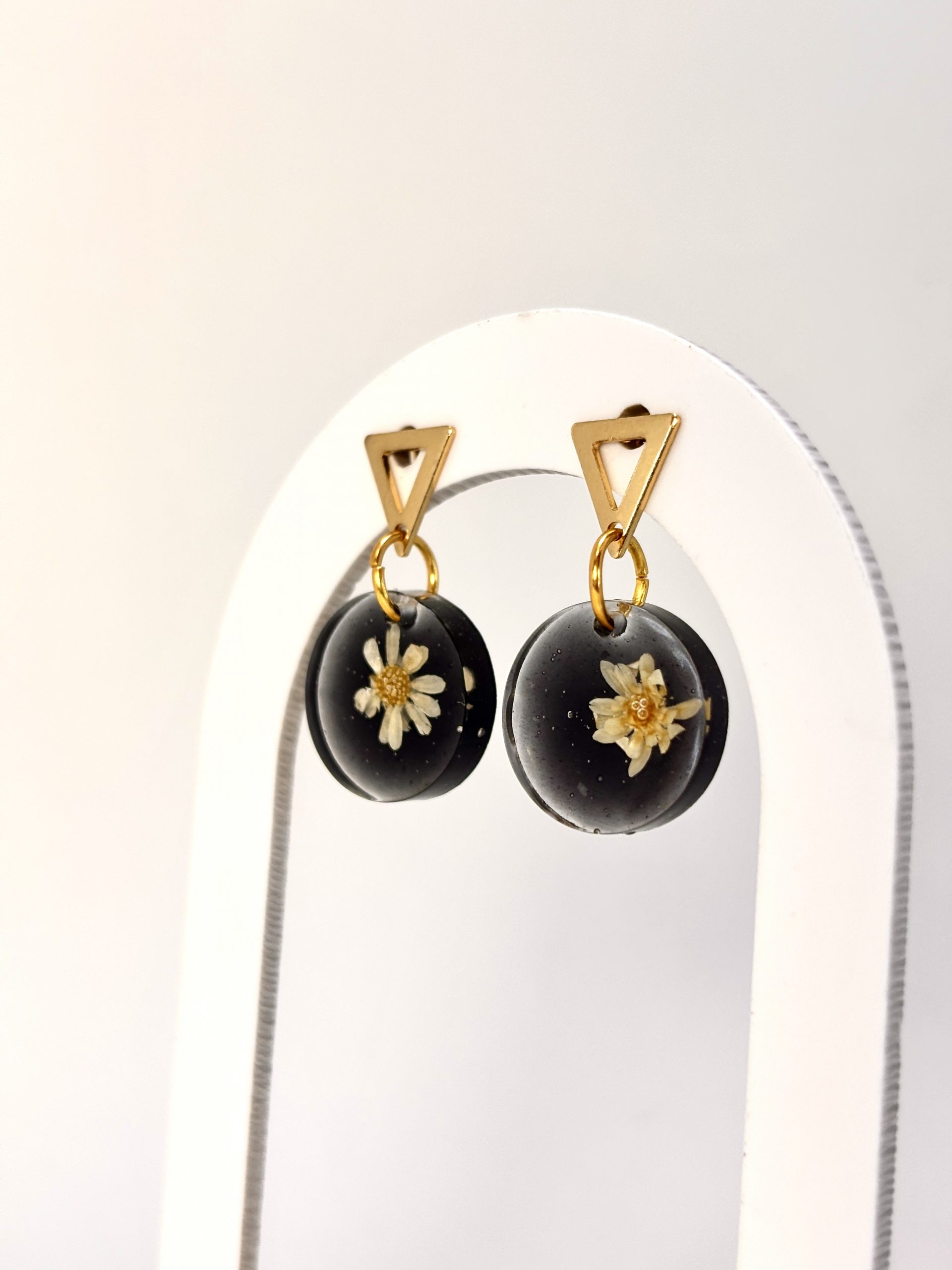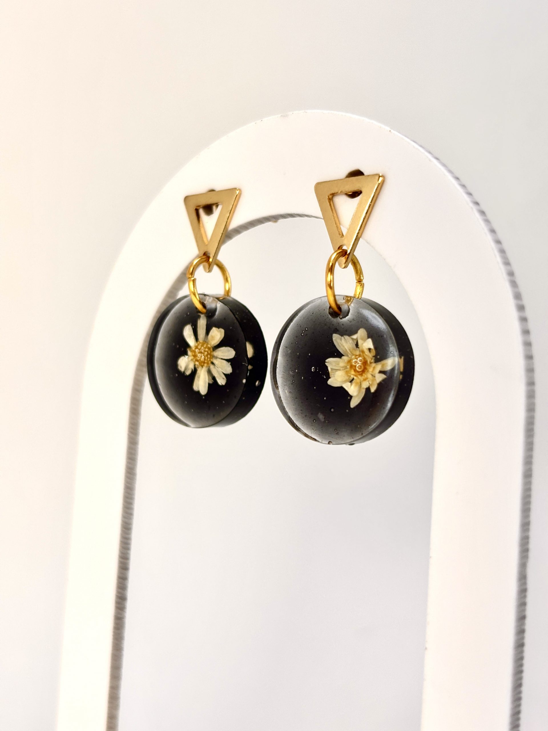 L’élégance du noir, la pureté du blanc. Ces boucles jouent sur les contrastes : une fleur de glixia naturelle suspendue dans une résine obscure, soulignée par un triangle doré minimaliste.