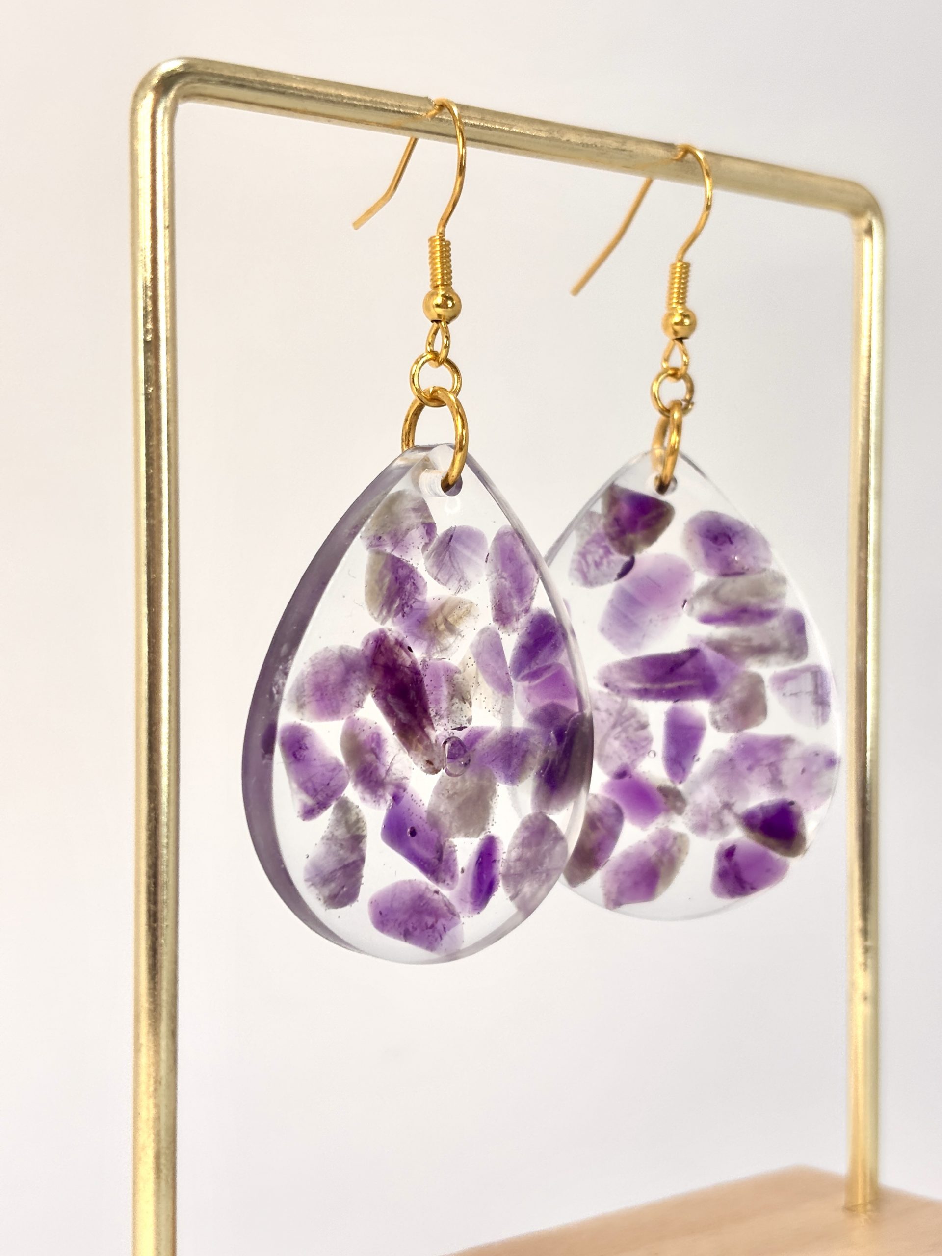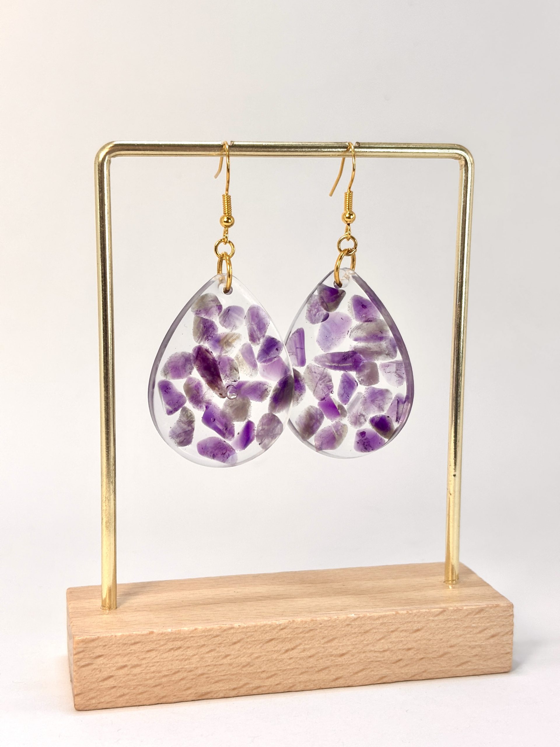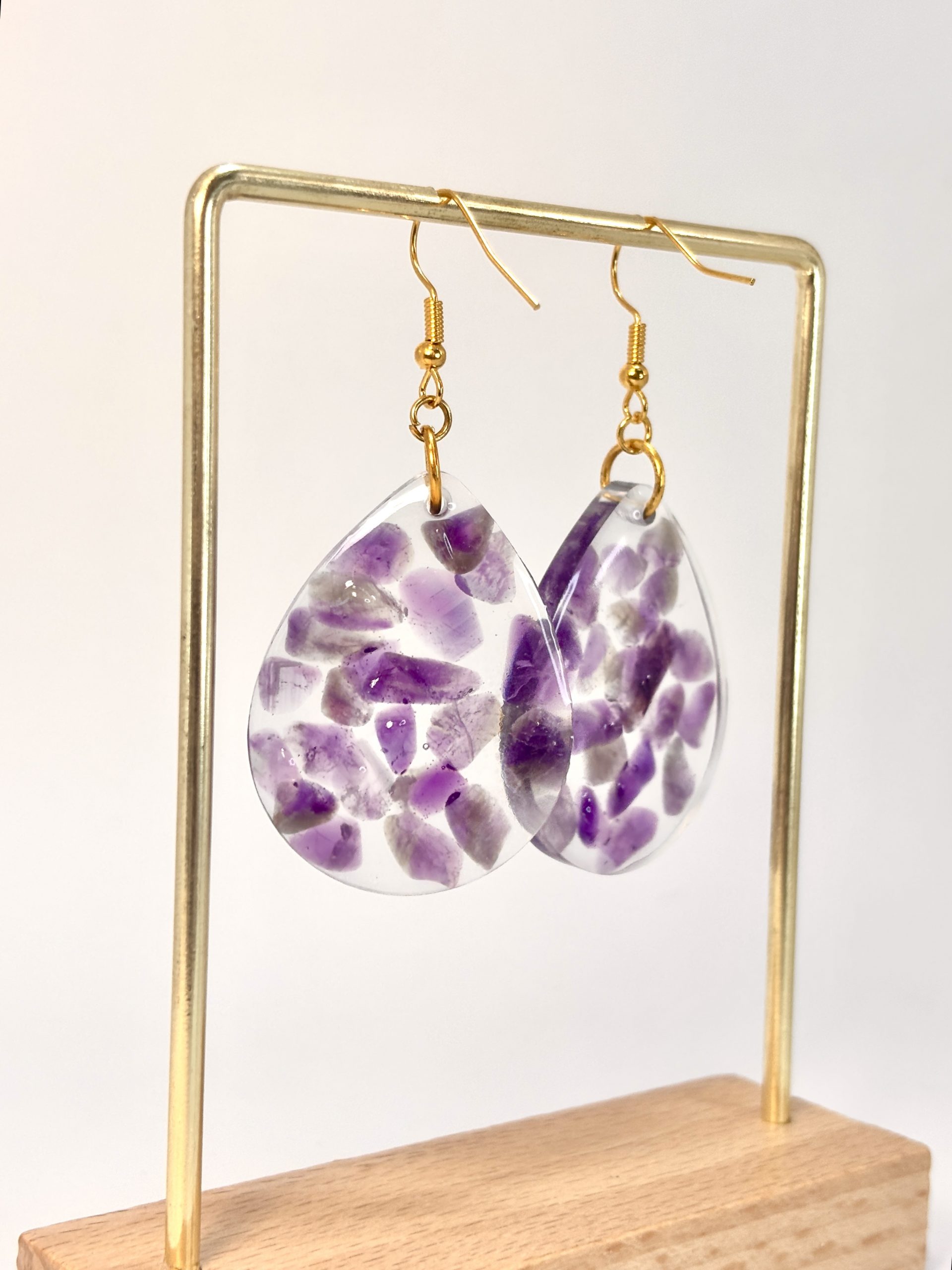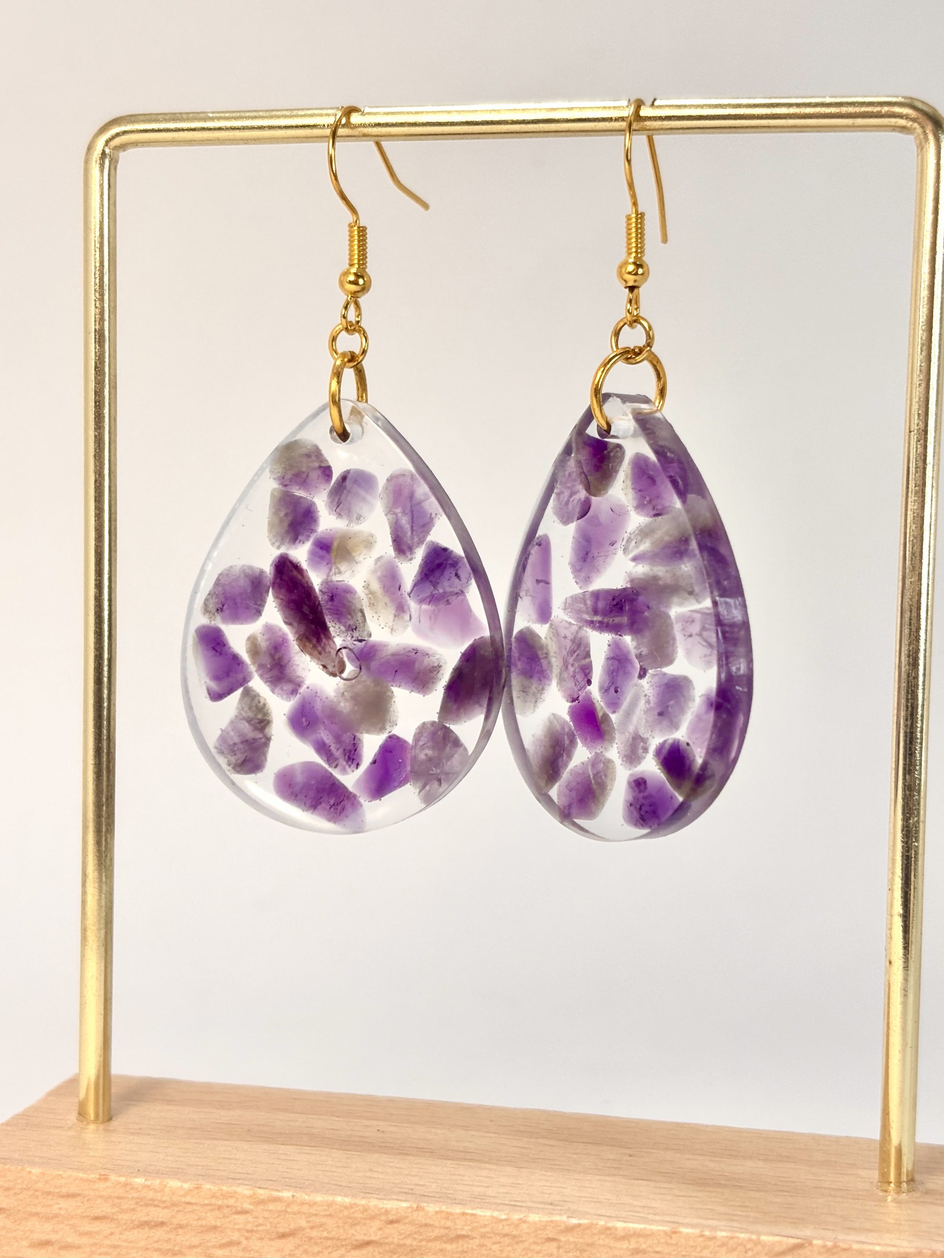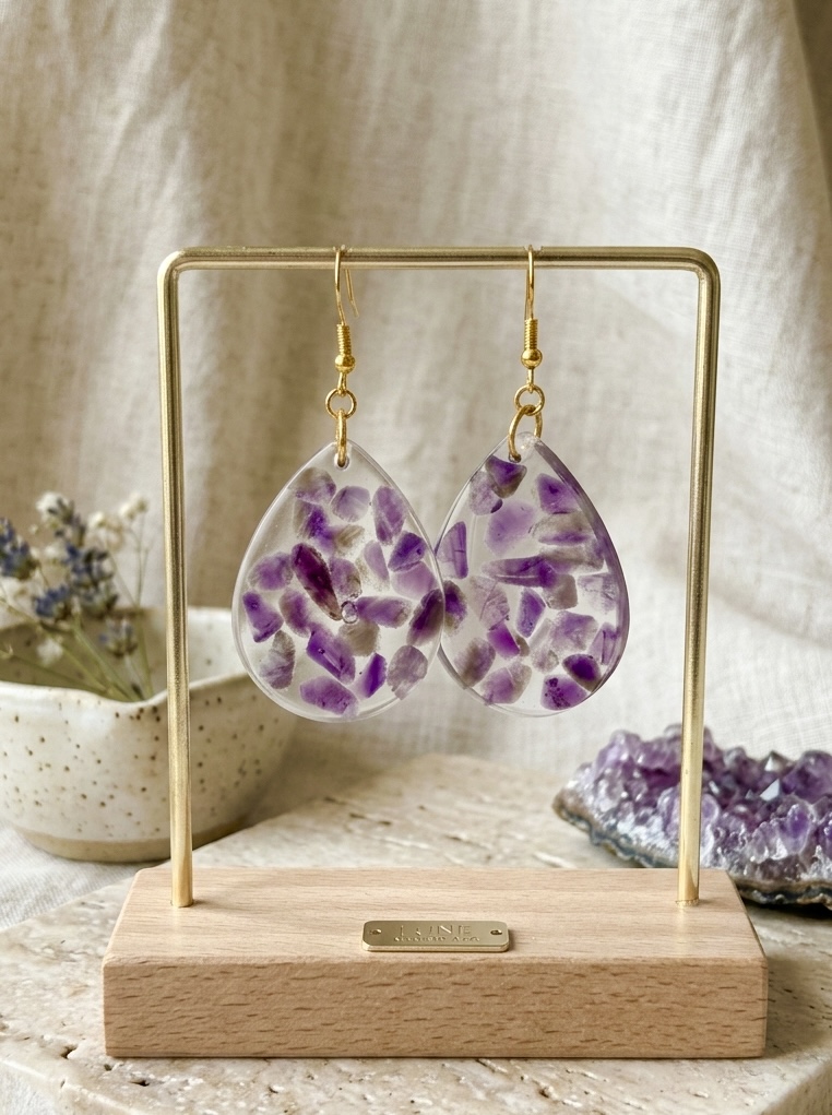 Imaginez un instant où l’énergie brute de la terre rencontre une clarté immaculée. Les boucles d’oreilles « Gouttes de Sérénité » sont bien plus que de simples bijoux : ce sont de petites œuvres d’art où chaque éclat d’améthyste raconte sa propre histoire. Leur processus de création est une célébration de la patience : des fragments de minéraux, sélectionnés à la main, ont été immergés dans la résine pour créer une mosaïque de violet et de lumière. Ainsi, vous avez la certitude que personne au monde ne portera jamais une paire identique.