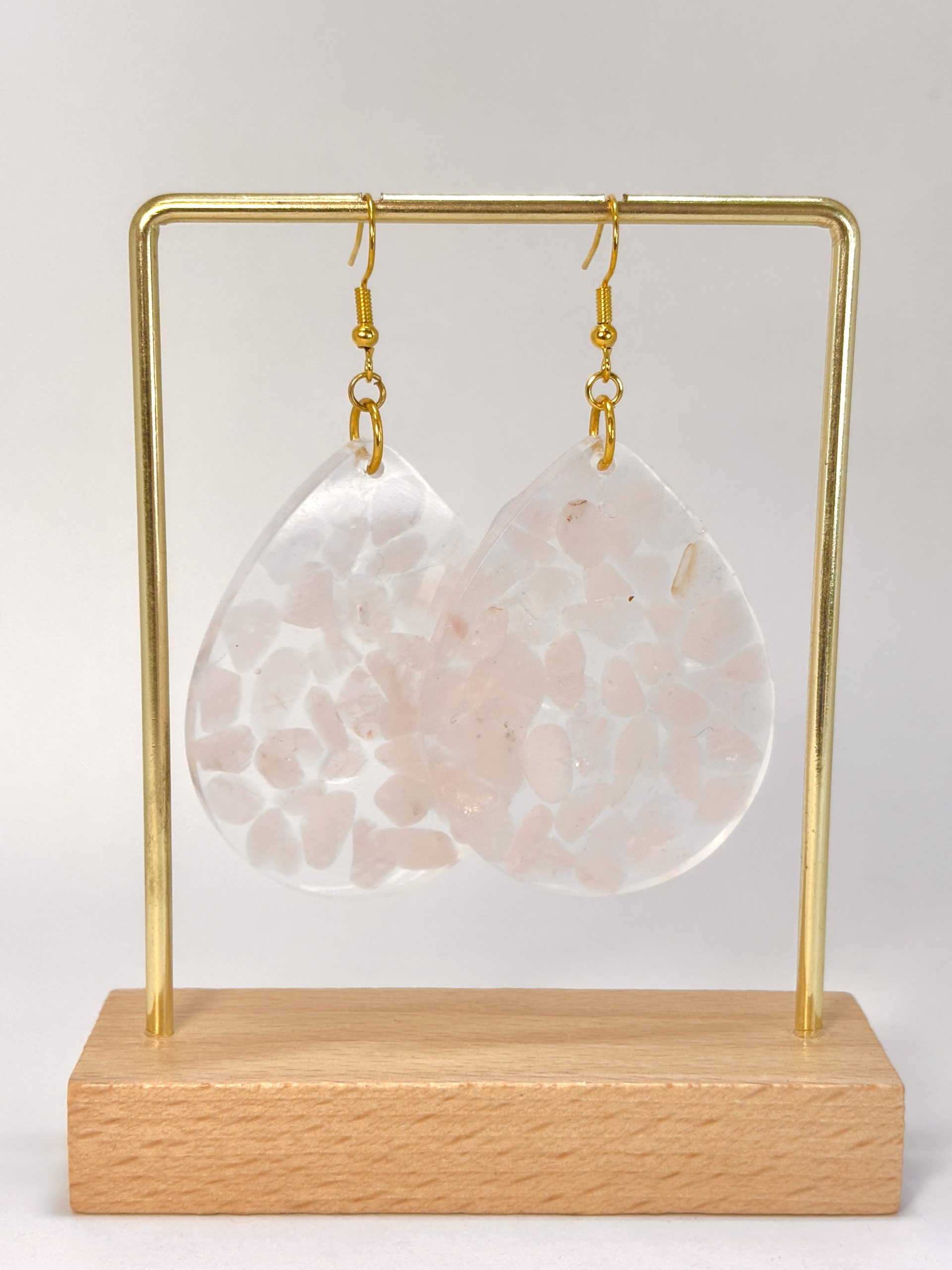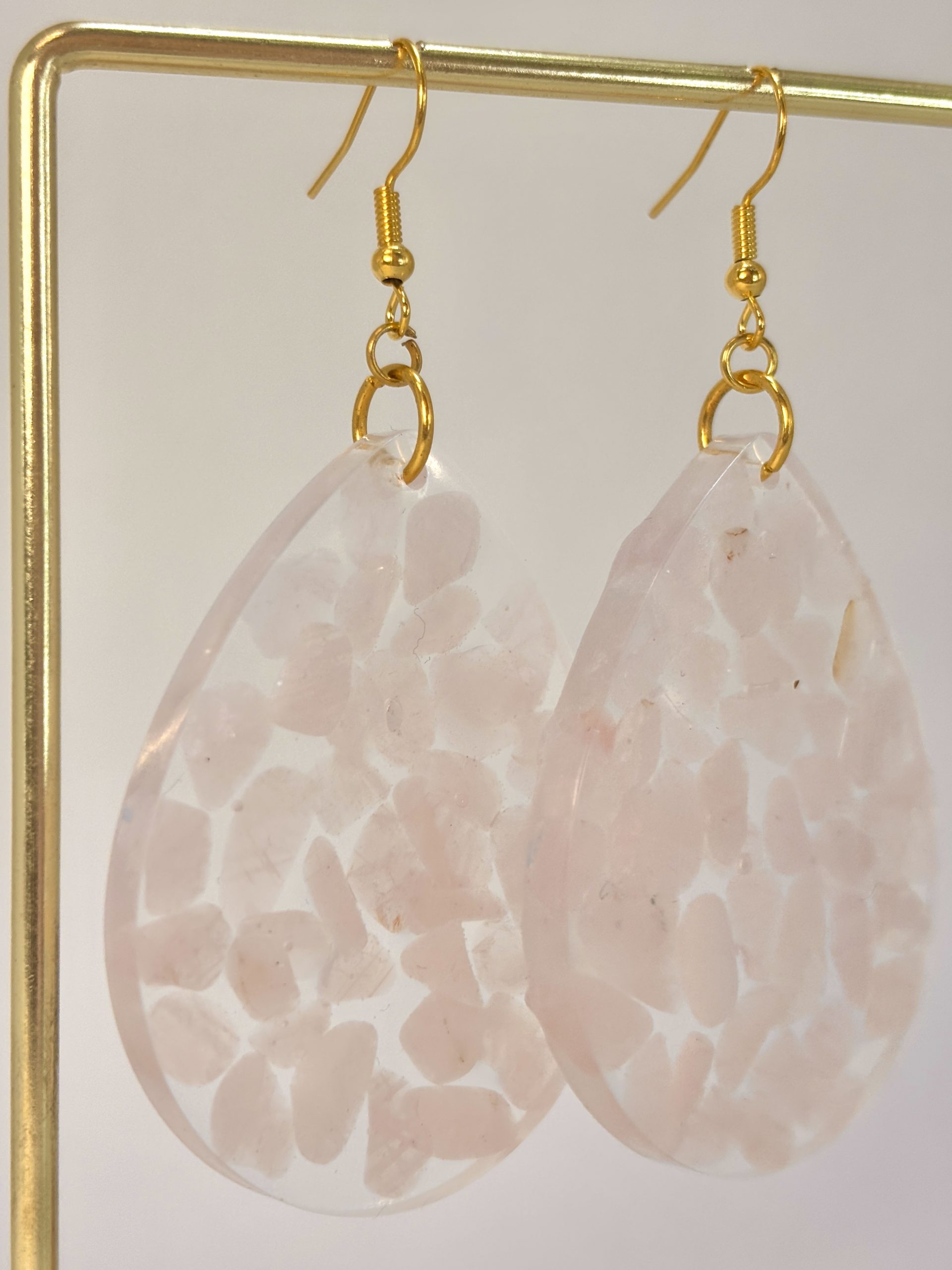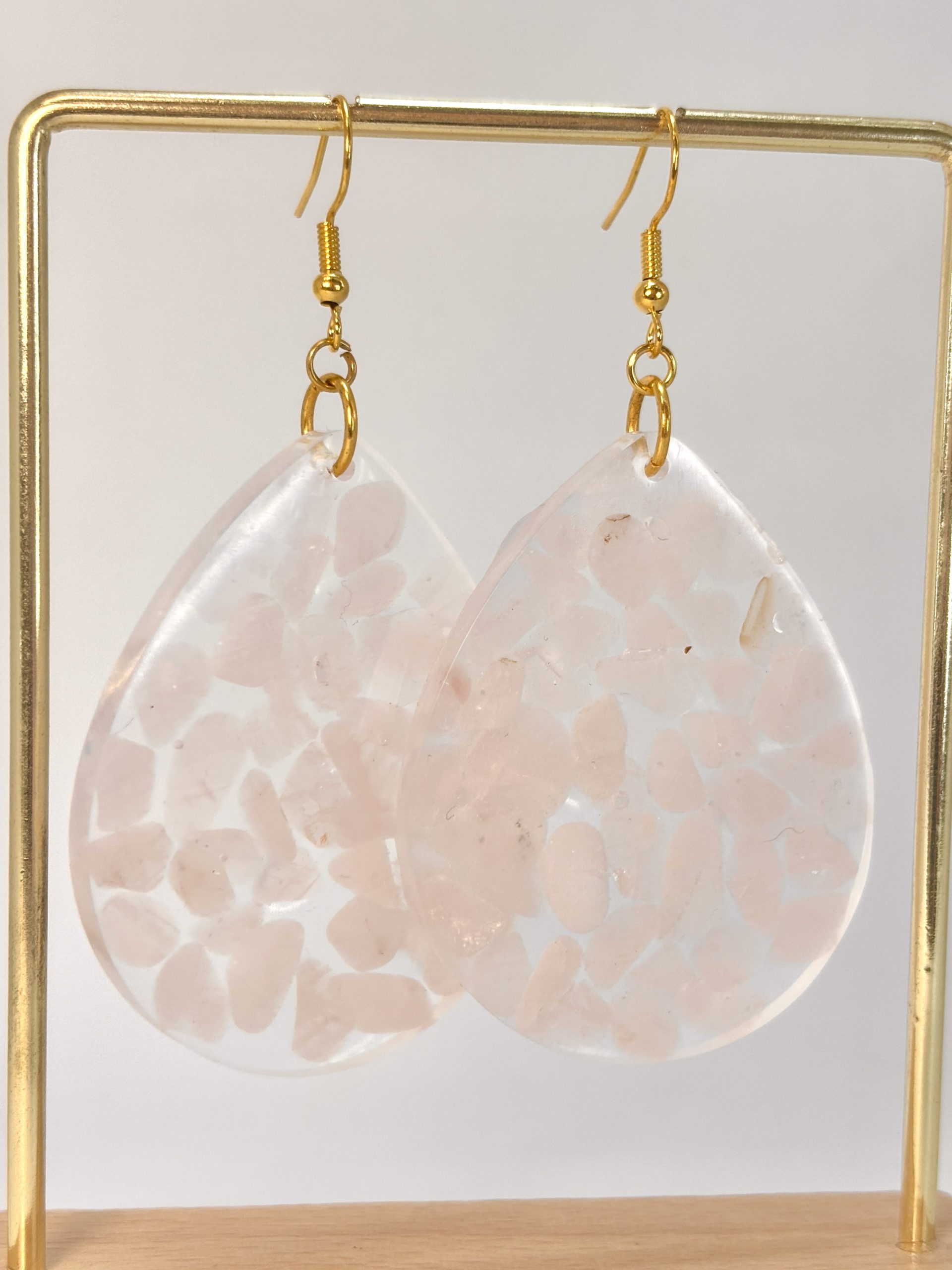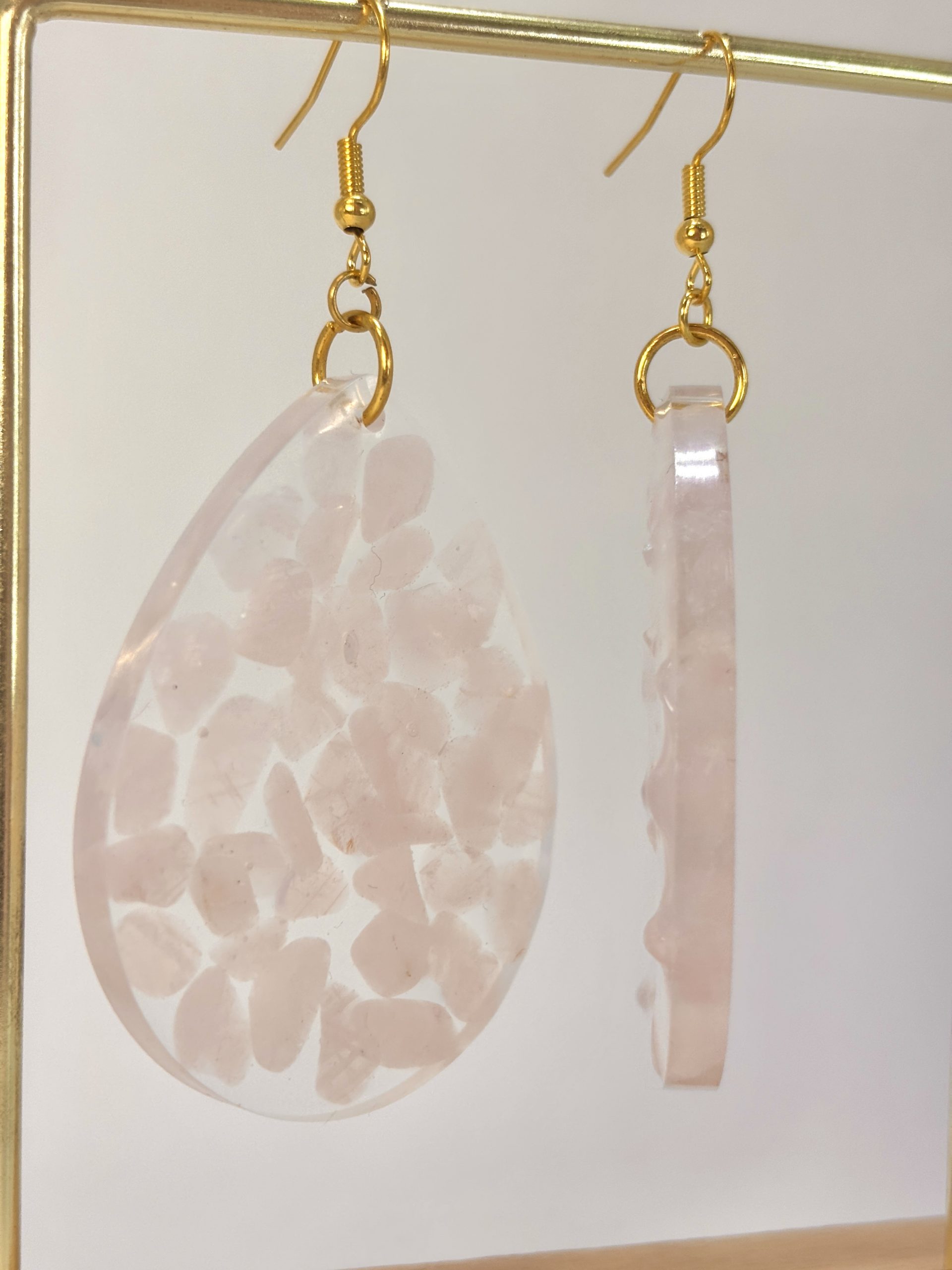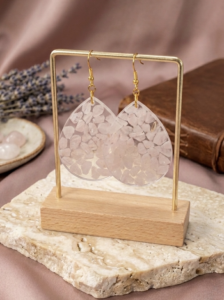Imaginez une promenade à l’aube, quand la lumière est encore tendre et que l’air palpite d’une promesse nouvelle. C’est précisément ce sentiment que j’ai voulu emprisonner dans ces boucles d’oreilles. Chaque petit fragment de quartz rose a été soigneusement choisi et disposé à la main au cœur d’une forme transparente. Puisque la nature ne crée jamais deux cristaux identiques, vous avez l’assurance que votre paire est une exclusivité absolue – tout comme votre propre histoire.
