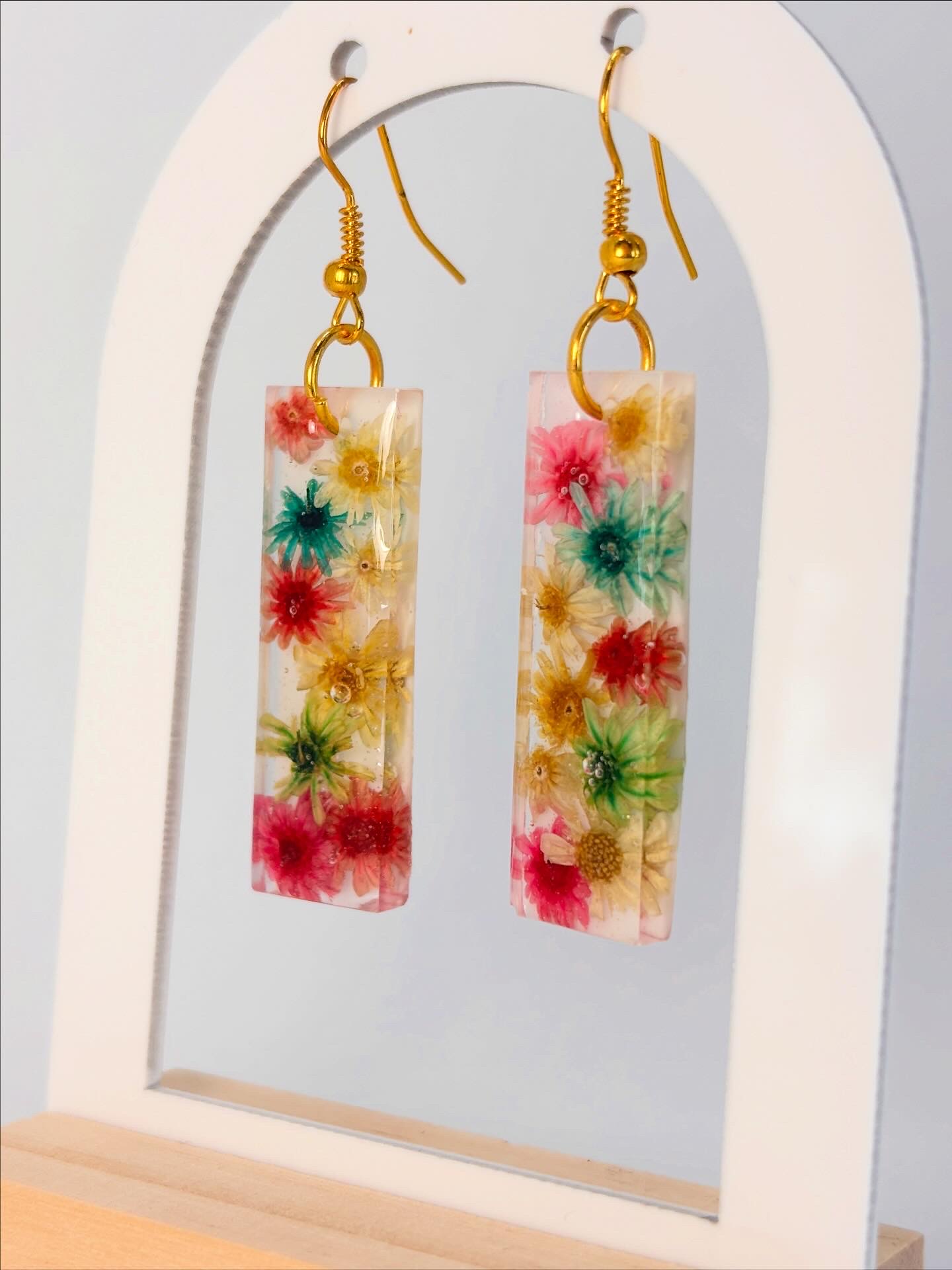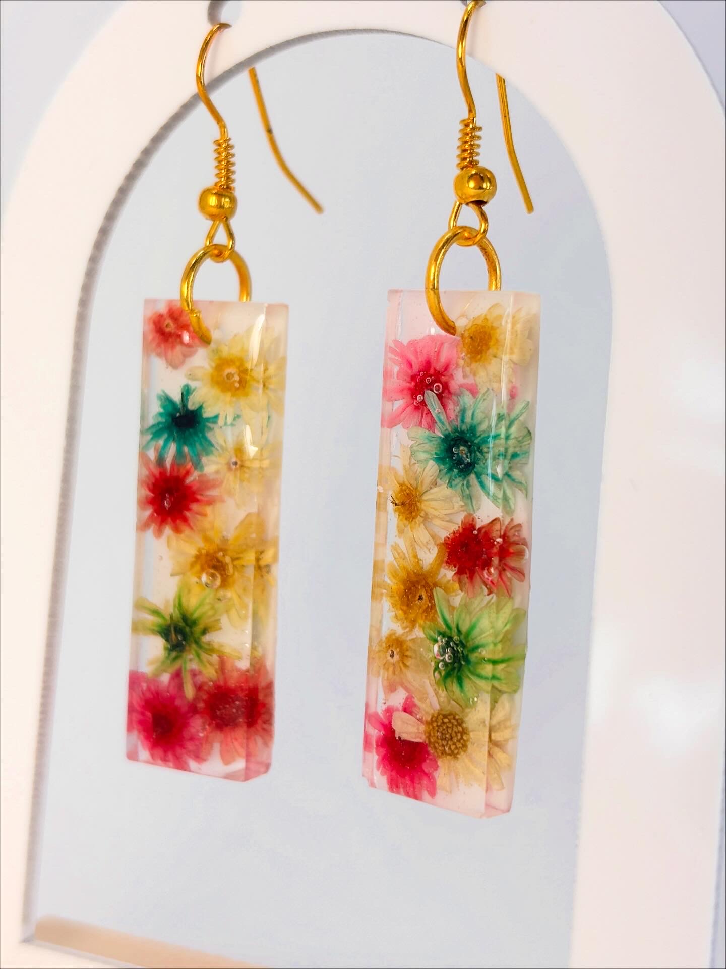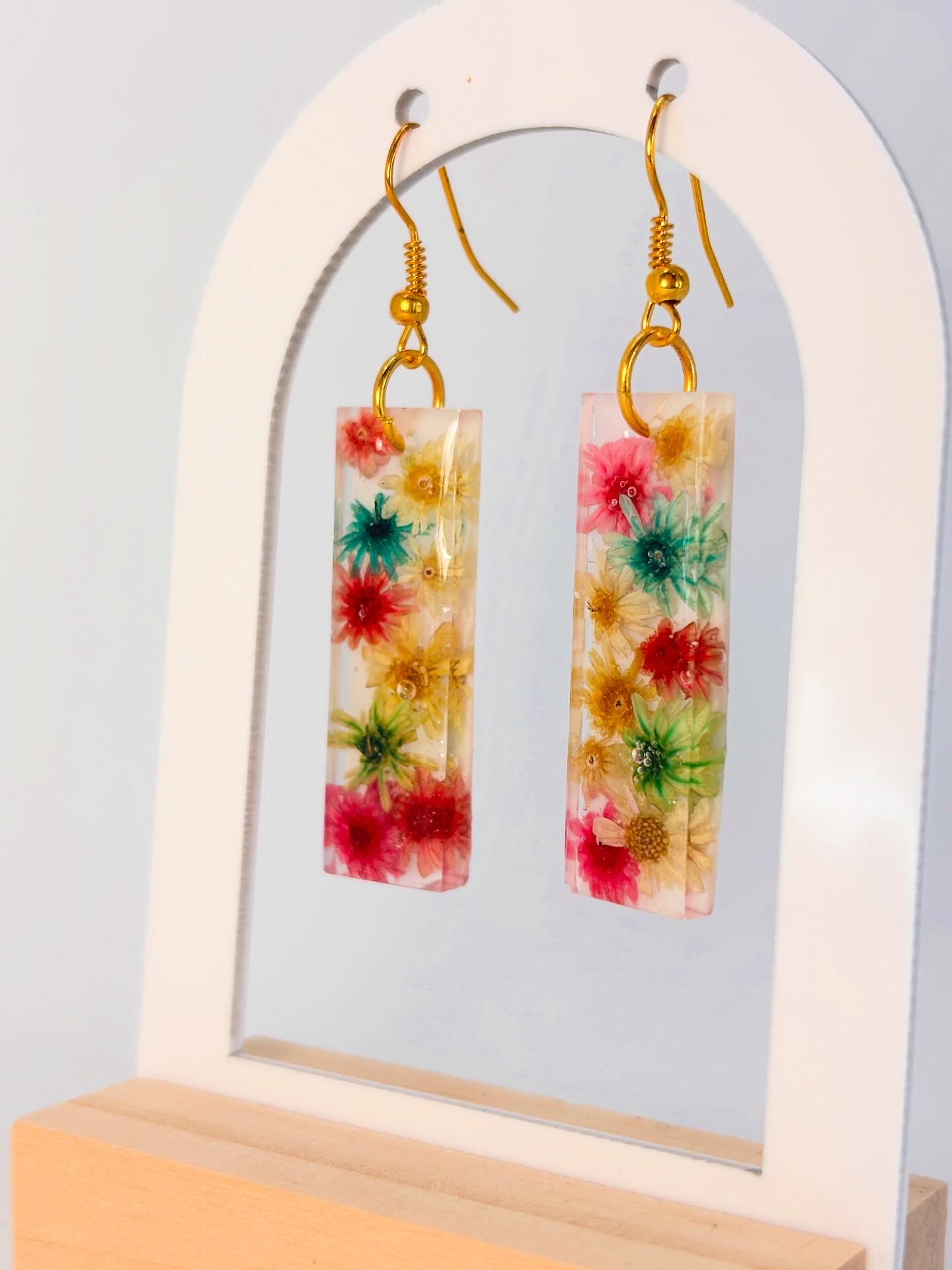 Voici la touche géométrique moderne dont votre collection a besoin ! Ces superbes boucles d’oreilles rectangulaires en résine allient parfaitement nature et design. Chaque pièce de ce bijou floral coloré est une toile unique, représentant une collection vibrante de vraies fleurs pressées méticuleusement enfermées dans une résine cristalline. C’est le cadeau fait main unique ultime pour celle qui aime le style contemporain avec une touche de charme bohème.