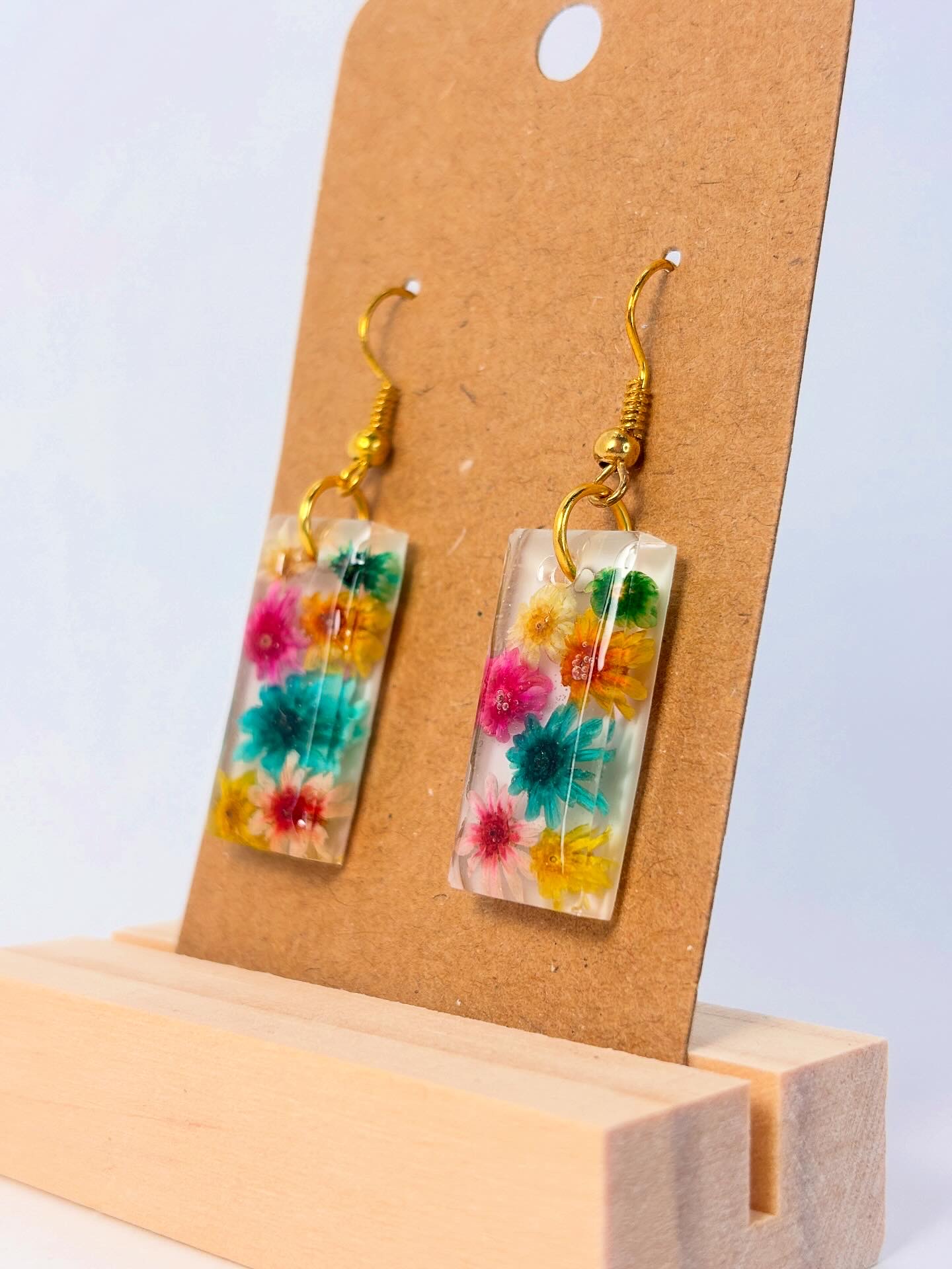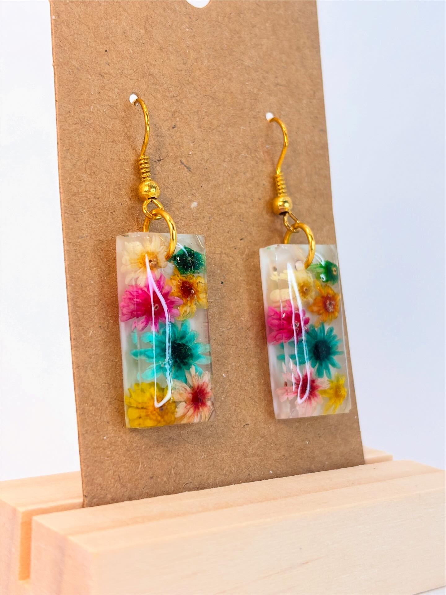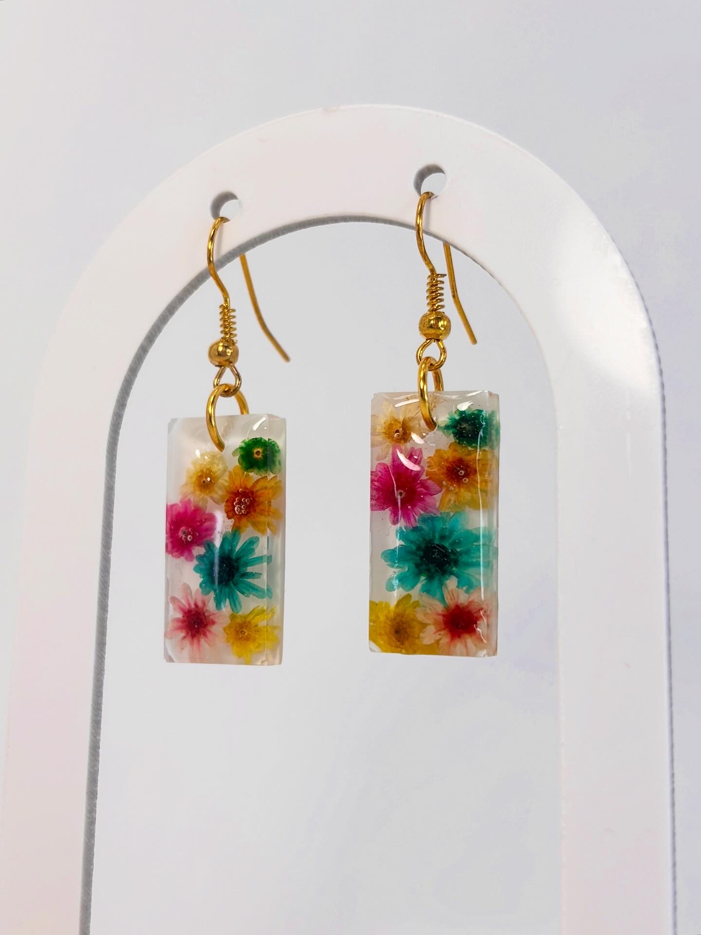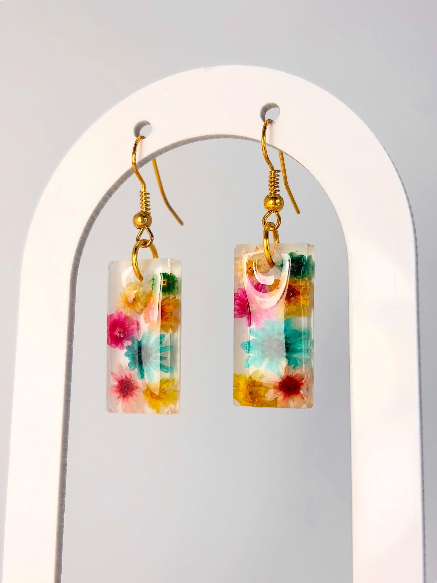 Ces superbes boucles d’oreilles barre rectangulaire en résine sont méticuleusement fabriquées à la main dans notre petit atelier en France. Chaque pièce de ce bijou botanique géométrique coloré présente un jardin vibrant de vraies fleurs pressées, soigneusement préservées dans une résine cristalline.