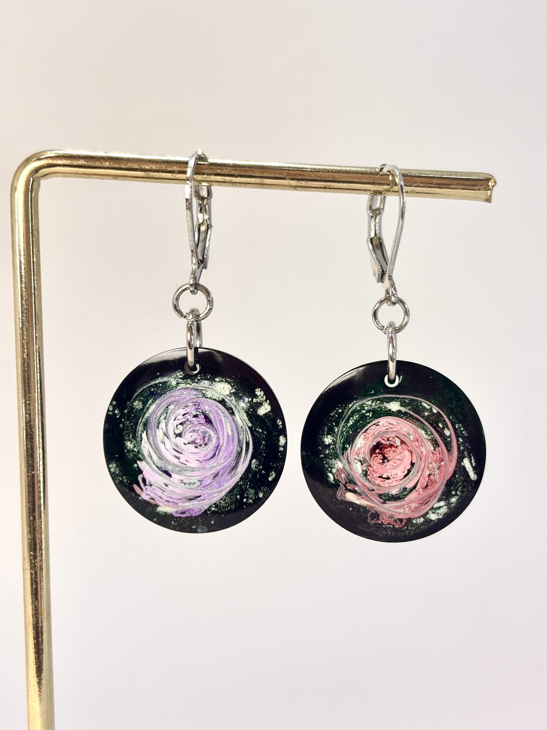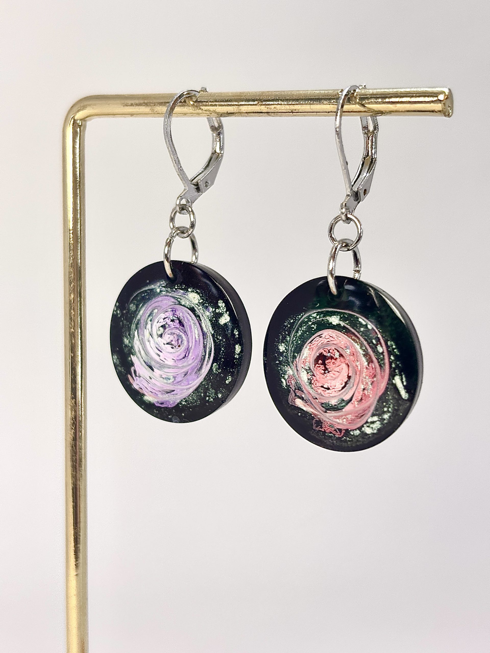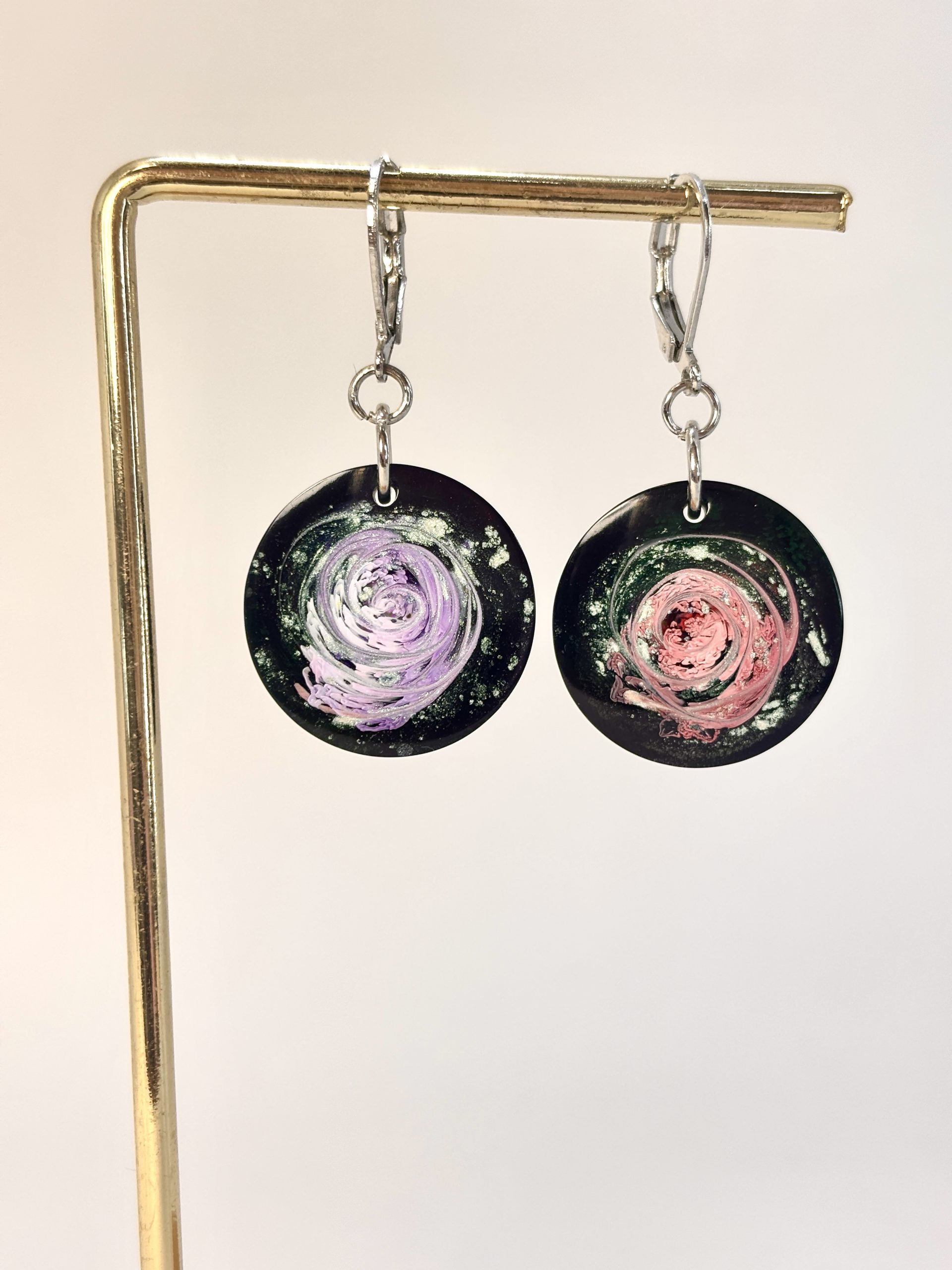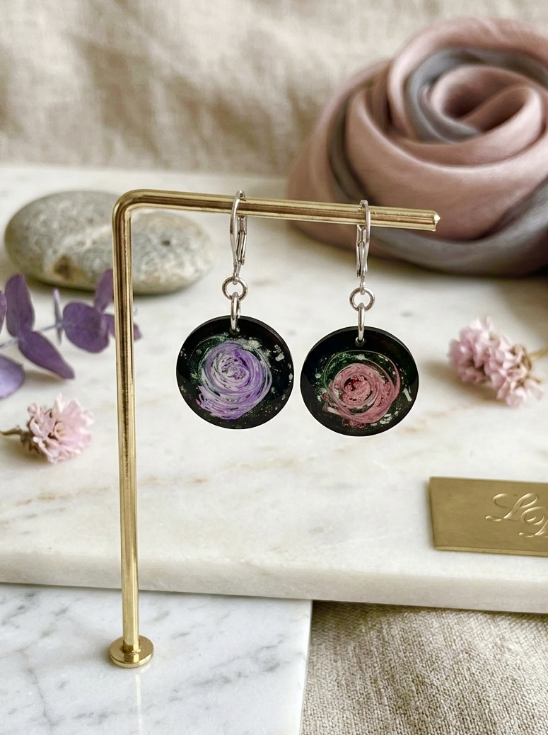 Ces boucles d’oreilles ne są pas de simples bijoux, ce sont de petits fragments d’univers suspendus dans une résine cristalline. Leur processus de création est une forme de lâcher-prise : je laisse les pigments tourbillonner librement, créant des formes qui rappellent les nébuleuses cosmiques. L’une révèle un violet subtil, l’autre un rose profond ; elles sont comme deux histoires différentes murmurées d’une même voix.