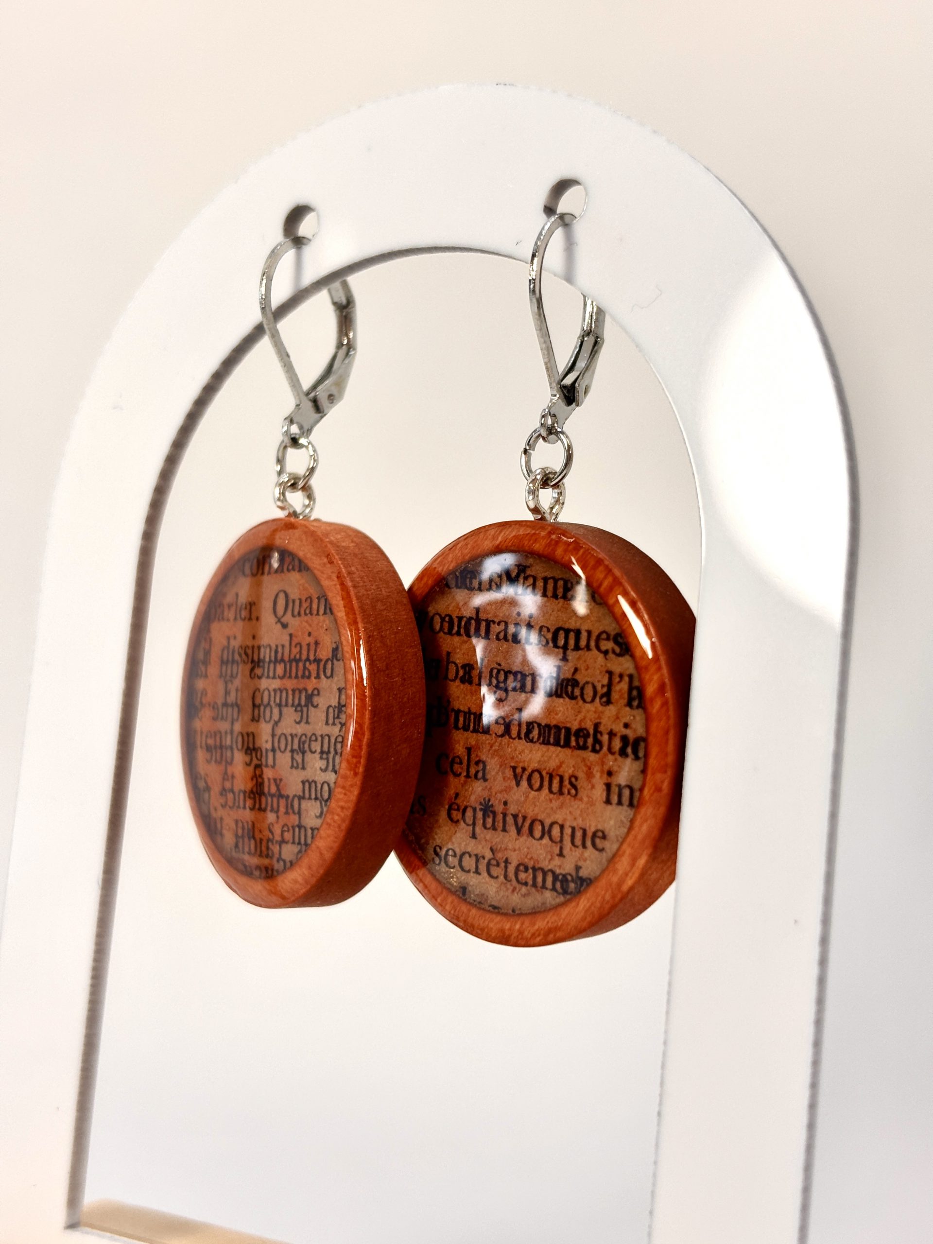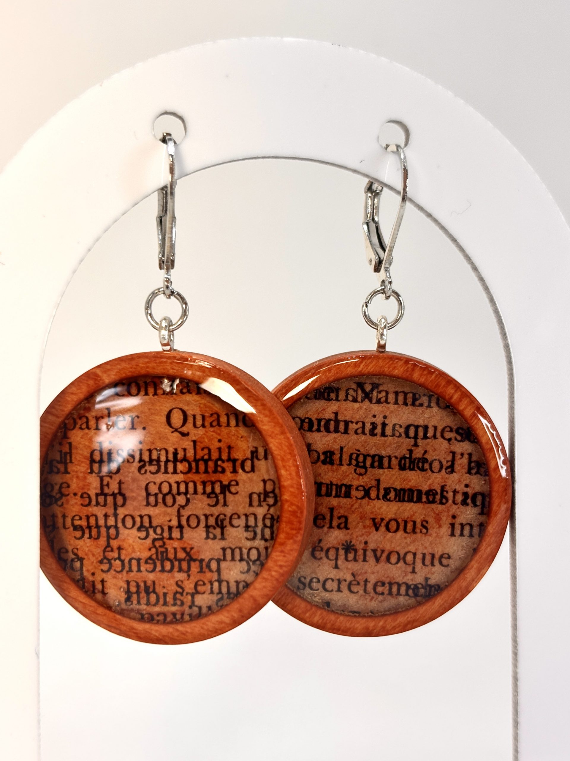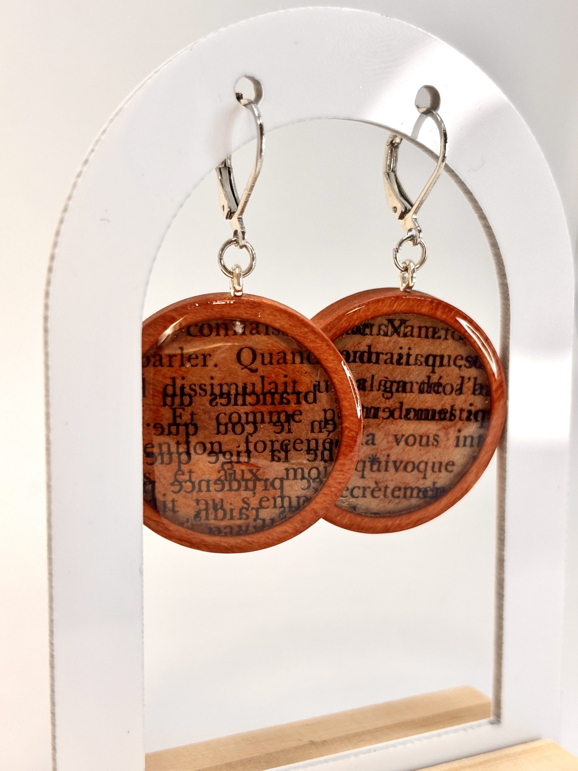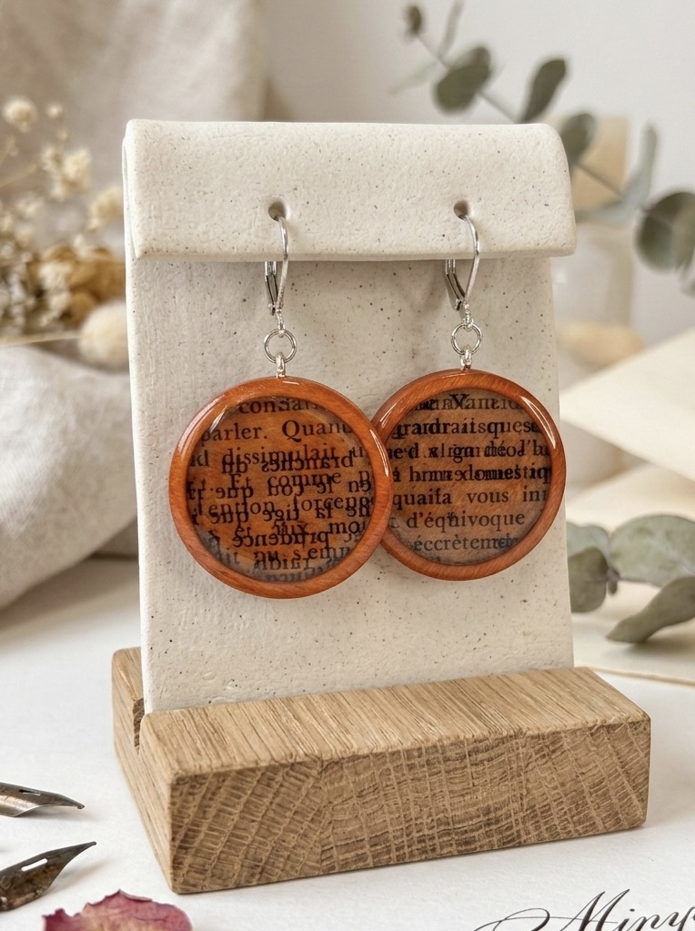 Bien plus qu’un bijou, le modèle Souvenirs Encrés est un talisman dédié aux amoureux et amoureuses de l’écrit. Au cœur de chaque boucle, j’ai capturé un fragment d’histoire : un morceau de papier authentique à la typographie délicate, magnifié par une résine qui lui offre une profondeur tridimensionnelle et un éclat précieux.